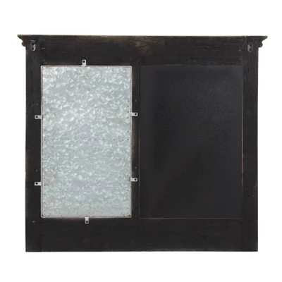 Organize your home in charming farmhouse style with this wood and metal wall organizer. The wood frame has a distressed shiplap finish when paired with the galvanized metal of the wall pockets will bring country rustic design into your home. The wood framed chalkboard writing surface measures 11 inches wide by 17.5 inches high. The two galvanized metal pockets each have an inner capacity of 9.5 inches wide by 5 inches deep with a 1.75 inch opening. The overall outer dimensions of this wall mounted organizer are 28 inches across by 25 inches high by 3.5 inches deep. Two metal triangle hangers are attached to the back for easy and secure wall display. This organizer arrives completely assembled ready to us. Hang this organizer in your entryway, kitchen, or home office for organization in beautiful rustic farmhouse style.