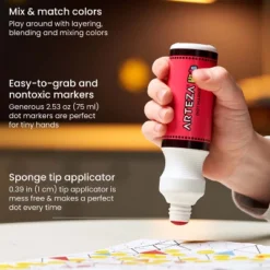 - Washable Paints – 6 markers with an easy grip tube with a no mess, sponge tip applicator
