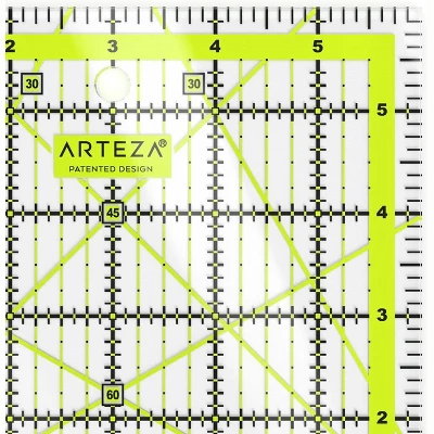 Arteza Quilter Ruler, Acrylic , 6″x6″ (ARTZ-8128): Clear Design – This Quilters Ruler is see-through and embossed with measurements, including a ½ inch seam allowance. Double-Colored Grid Lines – Our patented black and lime green grid allows you to easily see the fabric underneath, no matter the color. Durable Acrylic – Designed to last for all your quilting, sewing and craft measurements. Ambidextrous Angle System – Angles are vertically mirrored to make it convenient for left and right-handed people to use the ruler. Arteza makes art supplies affordable to creators with every budget.