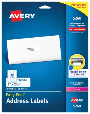 Easy Peel Address Labels are great when you want to create professional labels quickly and easily. They’re perfect for high-volume mailing projects, labeling bottles, Ball and Mason jars, food containers, bath and beauty products, product branding, event decorations, party favors and crafts. Sure Feed technology is designed for a reliable feed through your printer, helping prevent misalignments and jams. The patented Easy Peel feature makes applying these labels a breeze. Simply bend the label sheet to expose the Pop-up Edge, peel off your label and fold the sheet back to flat. To easily customize your labels, use Avery’s free online templates and designs.