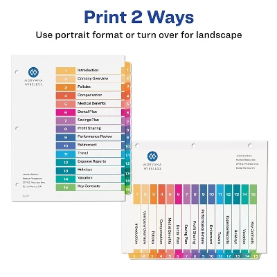 Navigate large documents easily with this 6-pack of Avery Ready Index durable multicolor preprinted 15-tab table of contents dividers. Each of the 15 tabs has a unique color and preprinted number, so you can identify sections at a glance, while the heavyweight paper, double-sided reinforced holes and reinforced tabs provide additional durability. These Avery Ready Index dividers can be customized for a personalized look. Tab dividers let you organize projects, personal documents, and more. Multicolor tab dividers. Divider Sheet Size: 8.5″” x 11″”. Three-hole punched and ready for use. 15 tabs per set, six per pack. Bright, Multicolored Tabs Locate the information you need quickly with these Avery Ready Index table of contents dividers, featuring bright, multicolored tabs for color-coding your documents. The table of contents page coordinates seamlessly with the matching pre-printed tab dividers, enabling you to reference various sections in less time. Easy to Customize Personalize the table of contents pages of these Avery Ready Index dividers by using the free Avery templates. The user-friendly online software makes it easy to produce just the right content. After downloading the template, simply open the table of contents page, and create well-made, professional-looking presentations without any hassle. Add section titles, your company logo or decorative graphics to customize the page further. Thick, Sturdy, Eco-Friendly Construction Even when you use these dividers frequently in the office, they remain durable and do not tear or wear out easily, thanks to the rugged, heavier paper, added tab reinforcement and double-sided hole reinforcement. The 20-percent post-consumer material makes these dividers an environmentally responsible choice for your business. Sold as 6/Pack.