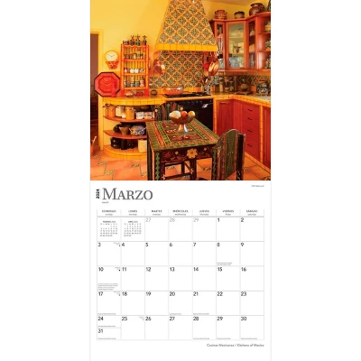 The decorative Mexican kitchen combines the enticing aromas of Mexican cooking with creative design and décor. With its elegant table tops, beautiful tile work, and finely crafted earthenware, la cocina mexicana is itself a work of art, even before any exquisite food is prepared. Admire a fantastic collection of colorful, warm, and charming Mexican kitchens in this delightful calendar. This Spanish-language calendar features month names, day names, and holidays in Spanish and English. It also includes holidays observed in Mexico and Puerto Rico.