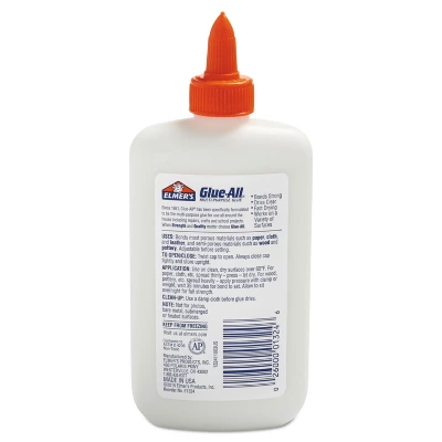 Put together school assignments, design crafts, and produce other projects with this 7.63-ounce bottle of Elmer’s Glue-All liquid glue. Attach various materials to poster board, fabric, and other items with this multipurpose liquid glue. The quick-drying formula makes it simple to get artwork, crafts, and other creations completed quickly, while the easy-to-use nozzle offers simple dispensing. This bottle of Elmer’s Glue-All multipurpose liquid glue creates a strong hold in order to repair broken items easily. Glue is perfect for use on paper, leather, ceramics, fabric, and other materials. Capacity: 7.63 oz. Color: white. Featuring a non-toxic nature. Sold individually. Sold as 1 Each.