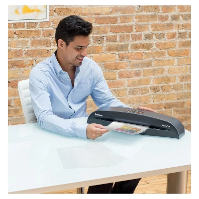 Protect your documents from tears and stains with this Fellowes Callisto 95 cold and thermal laminator. Keep well-maintained and stain-free documents by using this cold and thermal laminator. Thanks to InstaHeat technology, the warm-up time only takes one minute with lamination speeds of up to 19 inches per minute to increase productivity. A heat guard insulates the exterior from heat, while the reverse mode prevents jamming and allows repositioning of misaligned pouches. Different temperature settings allow for thermal lamination of documents of different sizes up to 9.5 inches wide and 5 mils thick and cold lamination of self-adhesive pouches. This Fellowes Callisto 95 cold and thermal laminator automatically shuts down when not in use to avoid overheating and conserve energy. Silver/black thermal and cold laminator for use with laminating pouches to protect documents. Provides lamination with a one-minute warm-up time, 19″ per minute laminating speed, and two rollers. 9.5″ wide throat supports input up to 9.5″ wide. Dimensions: 17.75″H x 5.75″W x 4.25″D. Advanced temperature control ensures smooth, consistent results. Hot-swap technology. Auto shut-off saves energy and prevents overheating. Package includes laminating pouches. The Fellowes Callisto 95 Laminator accommodates 9-1/2” wide documents and features an advanced control system that allows user to instantly change pouch and document thickness without waiting Unique HeatGuard Technology keeps heat inside so laminator is comfortable to touch. Offers three temperature settings for laminating both 3- and 5-mil hot pouches and cold self-adhesive pouches. Ready for heated lamination in five minutes and laminates a document in one minute. Reverse mode disengages pouch for re-centering or removal. Auto shut-off prevents overheating when not in use. Carrying handle for easy transport. Includes laminating starter kit. Sold as 1 Each.