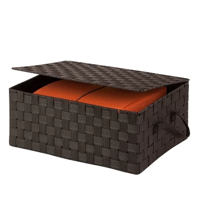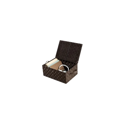 Clear the clutter with this hinged-lid storage box in contemporary woven strapping. Honey-Can-Do OFC-03704 Hinged Lid Woven Storage Box, Espresso. Measuring 17 inches long x 12 inches wide and 7 inches high, this storage solution provides ample space. Convenient storage space for your home or office. Durable double woven fabric. Coordinates with other Honey-Can-Do double woven storage products. Coordinates With Other Honey-Can-Do Doule Woven Storage Products. Sold as 1 Each.