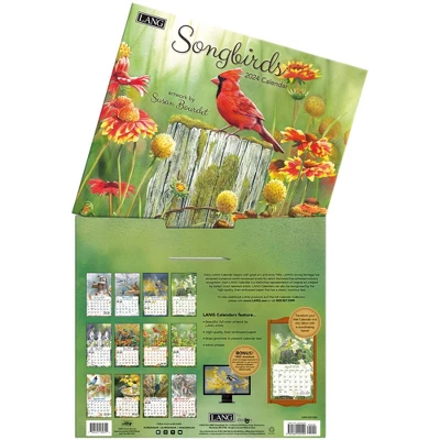 The Songbirds 2024 Wall Calendar is decorated with monthly artwork of cheerful birds famous for their colors and their songs by Susan Bourdet. LANG Wall Calendars feature monthly full color images, elegant linen embossed paper stock, and a brass grommet for hanging. Desktop wallpaper download available.