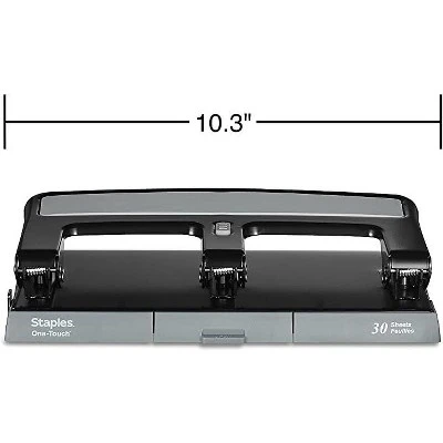 One-Touch 3-Hole Punch, 30 Sheet Capacity, Black (26614). Easy-to-use desktop three-hole punch meets high-volume punching needs. Punch heads deliver clean punching of 30 sheets of paper at a time. Punches circular holes. Features a black design for a professional look. Sold as 1 Each.