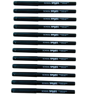Write on! School Smart Black Extra Fine Line Markers write like a pen, but with the boldness of a black permanent mark. Quick drying black ink is resistant towards heat, water, and smearing. Tip measures 1/2 millimeter for legible handwriting or sketches. Marker is ideal for labeling on most surfaces like acetate films, plastic, ceramic, and glass. Non-toxic. Conforms to ASTM D-4236 standards. Sold as 12 per pack.
