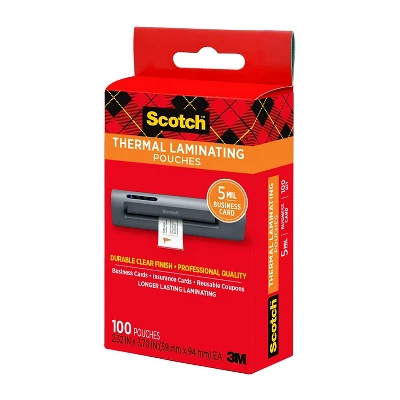 5 mil thick thermal laminating pouches for use in a thermal laminator. Increased thickness for durable use. Business card size to use for protecting your business cards and small documents. 100 per pack. Scotch Thermal Laminating Pouches protect documents you handle frequently.These 5 mil thick thermal laminating pouches are for use with thermal laminators. Pouches are clear to let important information show through. Business Card size Thermal Pouches for business cards. Protect items from damage. Clear professional finish. Photo safe. 100 per package. Great for business cards, library cards, insurance cards, and more. Safe for use with most household cleaners*. *Do not clean pouches before laminating, test a small amount in a corner before use especially on important documents, and do not use acetone. Sold as 100/Pack.
