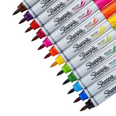 Sharpie Brush Tip Permanent Marker produces fine lines, bold strokes, shading with one tip and can be used on almost any surface. Marker controls the width of the lines, thick/thin with the pressure of your hand. Fade resistant marker is sold as 12 per set and includes assorted colors like black, blue, turquoise, green, lime, yellow, orange, pink, magenta, red, berry and brown.