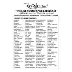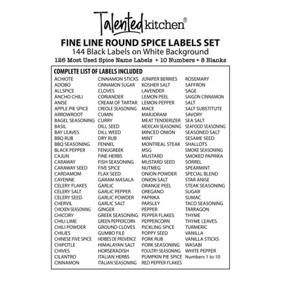 - Round Spice Jar Labels Preprinted, 144 Most Common Spice Names, Minimalist Style: 127 seasoning labels with the spices found in every kitchen. From spice pie, basil, and cinnamon, to spearmint, vanilla sticks, and tacos, a comprehensive reference sheet with an alphabetized list of labels is included with this set; 7 blank labels and 10 numbers are also included