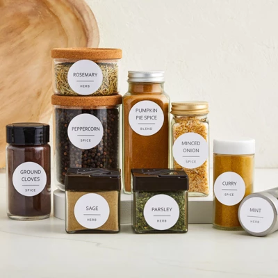 - Minimalist Round Spice Labels: Storage organization accessory for cabinet and drawer organization makeovers; this set includes the labels for spice jars only and does not include jars
