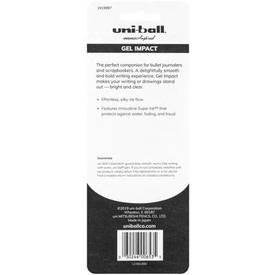 Gel Impact Metallic have bold, vibrant ink that pops on dark paper. Contemporary barrel design with rubber grip provides superior writing and comfort control. Partially transparent barrel provides ink supply visibility to avoid unexpected ink depletion. Features uni Super Ink, providing 3-way protection against water, fading and fraud.
