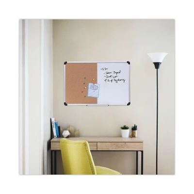 A great combination—versatile board is one half dry-erase magnetic lacquered steel writing surface and one half natural-cork bulletin surface. Satin-finished aluminum frame features attractive plastic corner accents. Board Type: Combination, Bulletin/Magnetic Dry Erase; Board Width: 36″; Board Height: 24″; Surface Material: Cork/Melamine. 36″W x 24″H. Aluminum frame. Combination melamine/cork board. Write on/wipe off melamine surface accepts dry erase markers. Aluminum frame (A048) with black/gray plastic corners. Includes marker tray. Mounting hardware included Versatile board is one-half nonmagnetic melamine dry erase surface, one-half cork surface. Combination design adds value by providing two boards in one. Non-magnetic whiteboards offer excellent writing and erasing qualities. Sold as 1 Each.